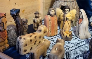 Piezas artesanales elaboradas con madera de timbó conjugan un pesebre nativo que se exhibe en la octava edición de la exposición 100 presepi in Vaticano, bajo la emblemática columnata de Bernini, en la Plaza de San Pedro.