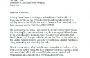 Peña recibió una invitación formal del presidente de EEUU, para integrar el Board of Peace, una nueva iniciativa internacional orientada a la promoción de la paz y la mediación en regiones afectadas por conflictos, con especial foco en la Franja de Gaza.